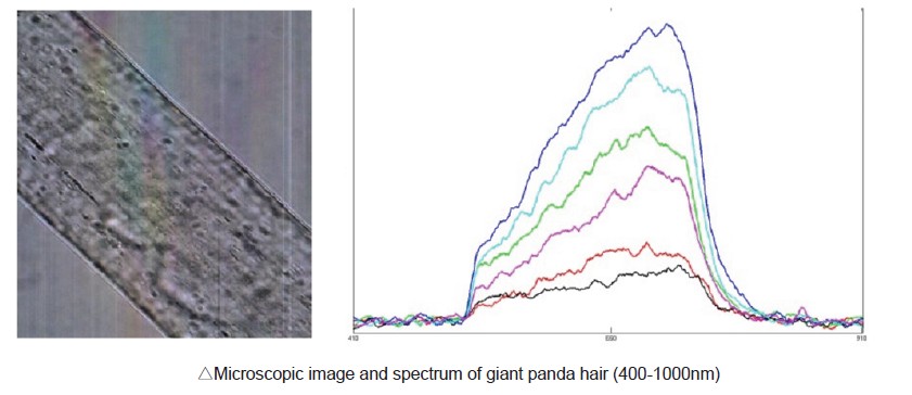 · 좌측 이미지는 자이언트 판다 털을 현미경으로 촬영한 영상이며, 우측 그래프는 400~1000nm 범위에서 측정된 털의 하이퍼스펙트럼 반사 특성을 보여줍니다.