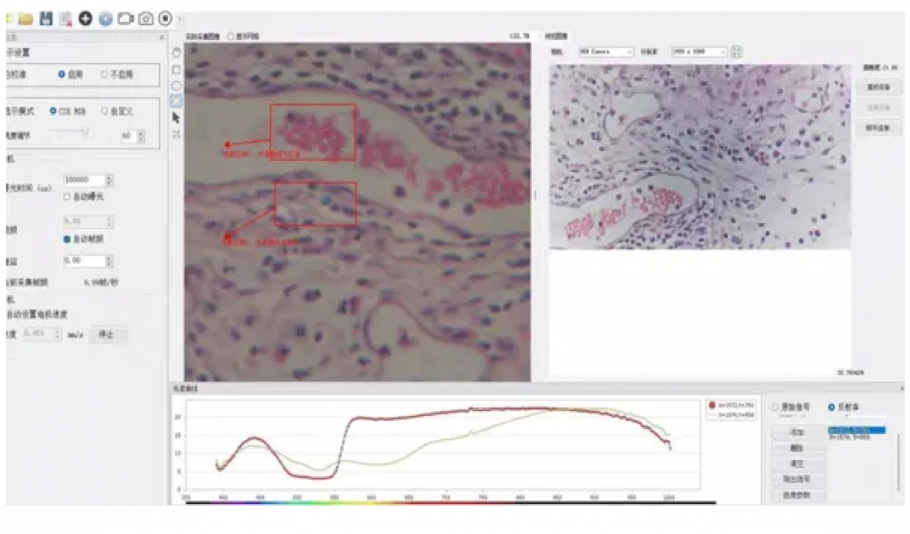 현미경에 휴대용 하이퍼스펙트럴 카메라를 결합하여, 언제 어디서나 미세 시료의 하이퍼스펙트럴 이미지를 간편하게 획득할 수 있습니다. 복잡한 설치 없이 고해상도 분광 데이터를 확보할 수 있어 연구 및 분석