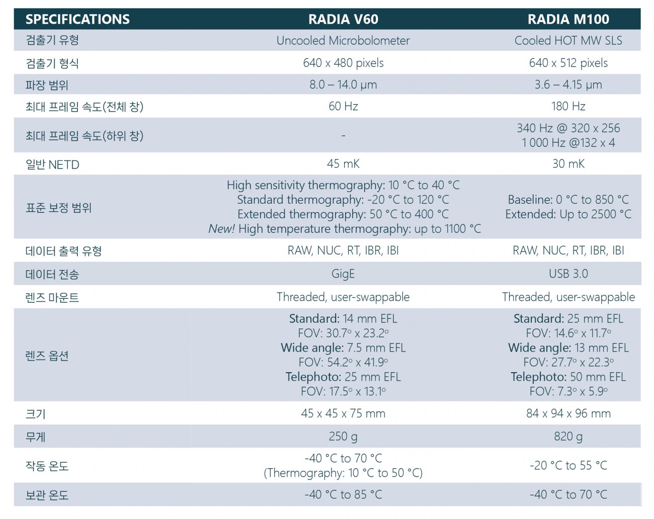 Radia 시리즈 카메라는 Low SWaP(Size, Weight, Power) 냉각식 열화상 카메라와 고성능 비냉각식 카메라 제품입니다.